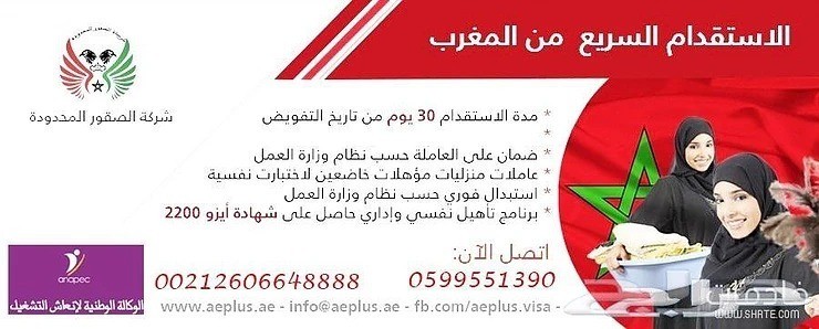 استقدام سريع من المغرب مكتب الصقور يوجد لدينا اقل اسعار استقدام العمالة المنزلية المغربية تبدء من 9500 ريال غير شامل التذاكر و فى مدة لا تتجاوز 25 يوم باذن الله و بالشروط التى تريدها 0599551390 إمكانية اختيار العاملة حسب شروطك الدفع بعد التفييز ضمان على العاملة 90 يوم نخدم جميع مدن المملكة خدمة إلكترونية لا تتطلب حضورك في اي مرحلة إمكانية استخراج التأشيرة بالنيابة عنك خصم خاص على العاملة المعينة من طرفك ( في حال ان لديك عاملة تعرفها محددة بالاسم ) نوفر جميع المهن المنزلية عاملة منزلية من المغرب خادمه من المغرب شغاله من المغرب ممرضه من المغرب طباخه من المغرب مربيه من المغرب كوافيرة من المغرب خياطه من المغرب مدرسه من المغرب اغتنم الفرصة و سارع بالاتصال او المراسله على الواتساب التواصل على 0599551390 https://youtu.be/kKuqM8gqfs8 قم بزيارة موقعنا https://www.aeplus.ae/ |