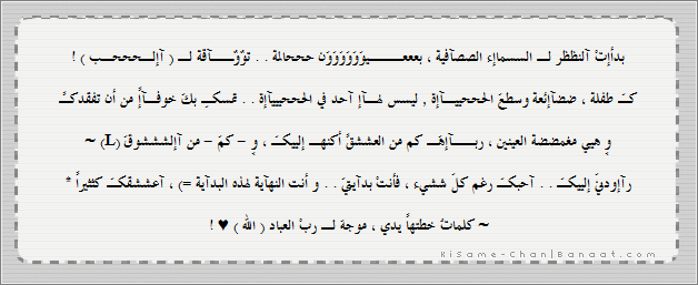 ما شاء اللة يا كيسامي الخاطرة عندها معنى جميل مع انها قصيرة... حبيت التصميم ![]() و ما اجملهشكرا لكي و لكي التقييم