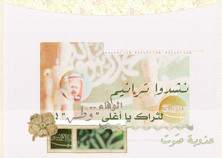 المصدر: منتديات بنات دوت كوم kQa],h jQvhkdl hg,thx gJevh; dh Hygn ,'Qk - sQthvm hgllg;m hguvfd~m hgsu,]d~m - الموضوع الأصلي : نَشدوا تَرانيم الوفاء لـثراك يا أغلى وطَن - سَفارة المملكة العربيّة السعوديّة - || القسم : الأناشيد والمرئيات الإسـلامـيـة || المصدر : منتديات بنات دوت كوم || كاتبة الموضوع : طُهرَ