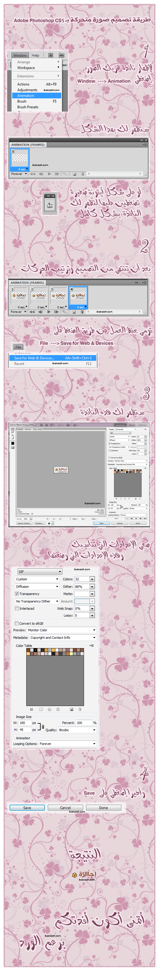 .................................................. .................................................. .................................................. ................................... ![]() السلام عليكم كيفكم بنوتــات ؟؟ وكيف إجازتكم ؟؟ ![]() برنامج الفوتوشوب كل فترة يطلعوا منه نسخ جديدة مطورة يكون فيها مميزات أكثر ويتغير فيها كل شي و نضيع فيها وما نعرف نستخدمها ![]() وعندكم مثال برنامج Adobe photoshop CS5 دمجوا فيه الإيميج ريدي والفوتوشوب وصاروا برنامج واحد وهذا شرح بسيط للي ماتعرف مكان شاشة الأنميشن أو ما تعرف تختار الصيغة المناسبة وطريقة الحفظ وغيره أترككم مع الدرس ![]() وهذا التصميم الي عليه الشرح هو لموضوع كيسامي الجميل ![]() هنا ---> [ ]مع الأسف ما حأقدر أقول ---> أنتظر تطبيقاتكم ![]() بس عالعموم الي استفادت ياريت ترد و تقييمني وكذا يعني ![]() وأي سؤال أو مشكلة بهالإصدار من الفوتوشوب تأكدوا إني بالخدمة دائما ![]() المصدر: منتديات بنات دوت كوم jwldl w,vm ljpv;m fJJ Adobe Photoshop CS5 الموضوع الأصلي : تصميم صورة متحركة بــ Adobe Photoshop CS5 || القسم : لنُحلق مَـعاً في سَماء الفُـوتـوشـوب || المصدر : منتديات بنات دوت كوم || كاتبة الموضوع : برعم الورد