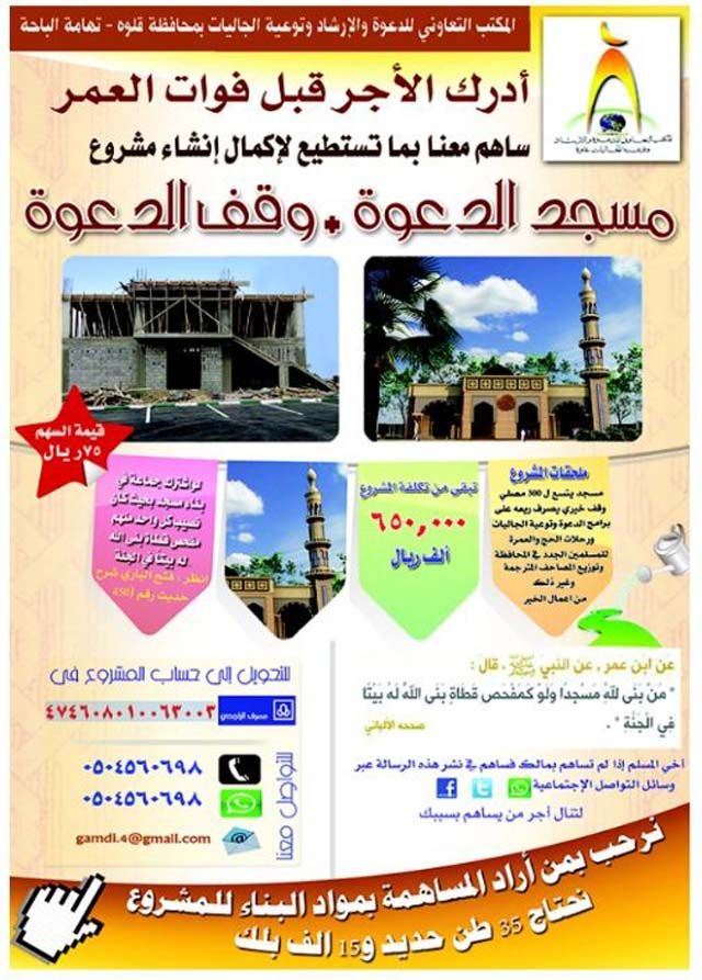 بسم الله الرحمن الرحيم المشروع تابع للمكتب التعاوني للدعوة والإرشاد وتوعية الجاليات بمحافظة قلوة - تهامة الباحة قال نبينا صلى الله عليه وسلم ( منْ بنى مسْجدا لله كمفْحص قطاةٍ بنى اللهُ لهُ بيْتا في الْجنة ) صححه الألباني ولو اشترك جماعة في بناء مسجد ، بحيث كان نصيب كل واحد منهم مفحص قطاة بنى الله لكل واحد بيتا في الجنة انظر " فتح الباري " شرح حديث (450 ) السهم ب 75 ريال فقط وبالإمكان المشاركة بأي مبلغ وبأكثر من سهم يحتوي المشروع على التالي : مسجد يتسع ل 300 مصلي + وقف ريعه على برامج الدعوة وتوعية الجاليات ورحلات الحج والعمرة للمسلمين الجدد في المحافظة للدعم في حساب المشروع على مصرف الراجحي (حساب خاص باسم الجاليات وسيخرج لك اسمهم على شاشة الصراف) 474608010063003 للتواصل والاستفسار / 0504560698 الرجاء المساعدة في نشر الموضوع في المنتديات والإيميلات والقروبات وتذكر ان الدال على الخير كفاعلة |