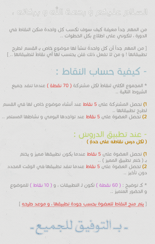 الموضوع الأصلي : ¦[ ๑ كيف يتمَ حساب - النقاط - للمُشتركات فِي الدورة ! ]¦ || القسم : انتهتَ !"> - دورة الفوتوشوب | انتهتَ ! || المصدر : منتديات بنات دوت كوم || كاتبة الموضوع : إدارة الـمـنـتـدى